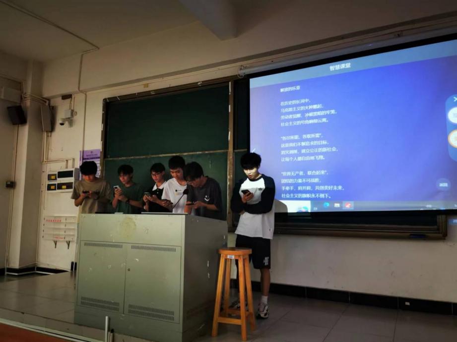 每一位朗读者用清晰、流畅、富有感染力的声音表达了对社会主义的理解和对中国特色社会主义的赤诚热爱之心。有的学生以《共产党宣言》的发表为蓝本,歌颂马克思、恩格斯等无产阶级革命领袖对创立科学社会主义的崇高理想。也有学生扮演“列宁”,以朗诵的形式诠释了俄国十月革命的胜利掀起全世界被压迫民族的解放运动;更有学生以李大钊为典型,通过其创作的《青春》“以青春之我,创建青春之家庭,青春之国家,青春之民族,青春之人类,青春之地球,青春之宇宙…”进而赞扬在中国社会主义探索发展的路上,无数青年人那种时不我待的奋斗与牺牲精神!赢得了台下学生和授课老师的阵阵掌声。