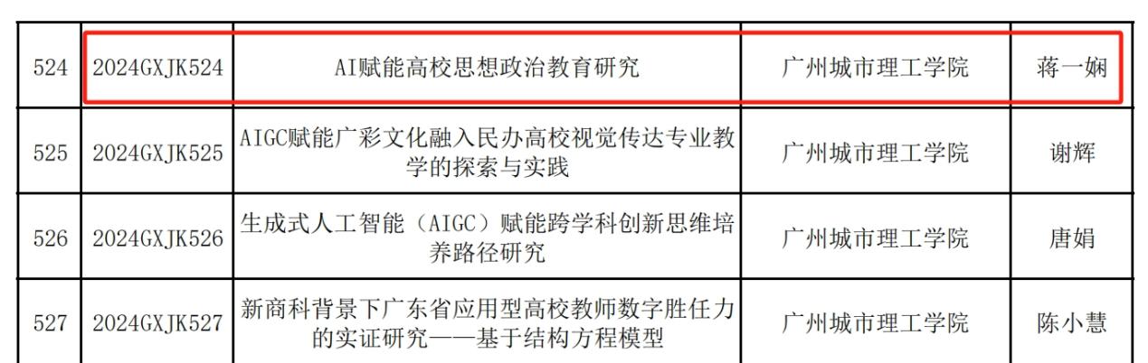 本网讯(记者 全春丽)近日,广东省教育厅公布了2024年度教育科学规划课题(高等教育专项)立项名单,马克思主义学院蒋一娴老师主持申报的课题《AI赋能高校思想政治教育研究》获得立项。