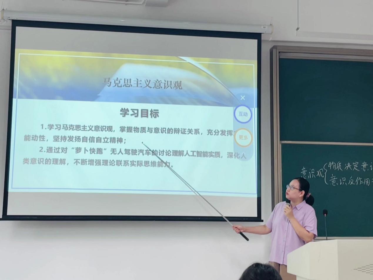 在教学过程中,王老师紧密结合教材内容,采用启发式教学方法,逐步引导学生们深入理解马克思主义意识观的理论内涵和实践意义。她不仅详细讲解了意识与物质的关系、意识的社会性等基本原理,还通过多个生动具体的案例分析,如“狼孩”的故事揭示了意识作为社会历史产物的特性、通过对比蜜蜂筑房与人的社会实践活动,强调了人类意识活动的能动性和创造性。此外,王老师还引入了“萝卜快跑”无人驾驶汽车案例,深入分析了人工智能与人的意识之间的辩证关系,将抽象的理论知识转化为易于理解、贴近生活的实例,帮助学生们更好地掌握并运用这些理论知识。