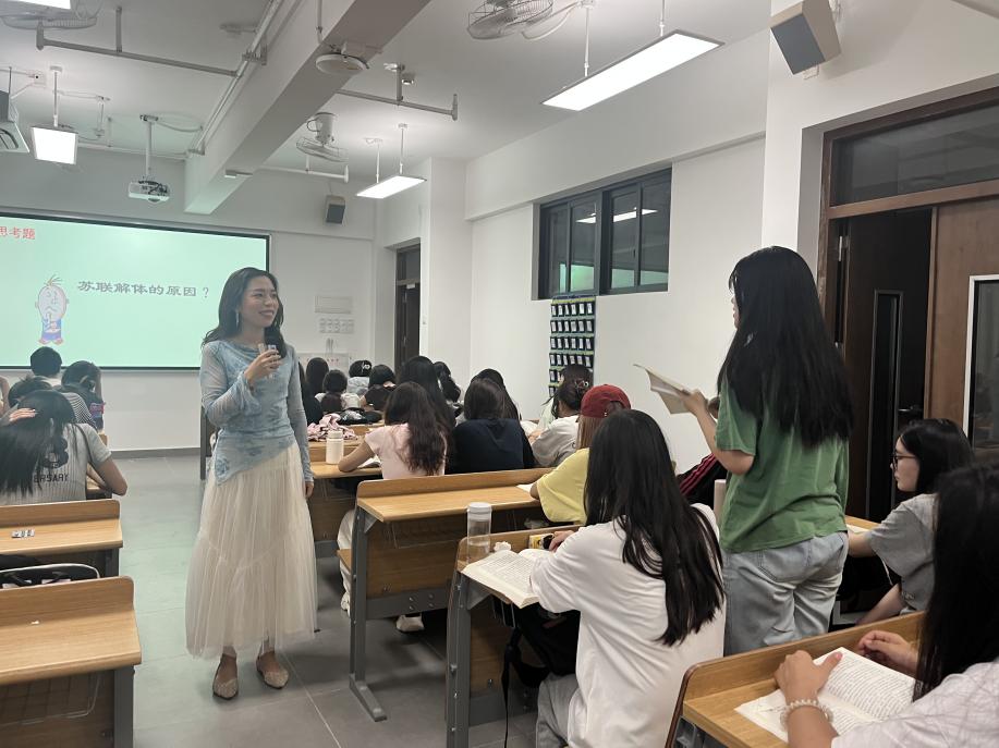 本次公开课通过“社会主义从一国到多国发展与苏联模式”和“世界社会主义的曲折与奋起”的内容讲授,启发学生在知识学习中领略二十世纪苏联社会主义建设与改革的风云变化。课上,陈姣娣老师首先引导学生详细回顾了上周主要学习内容,并围绕本节课重点内容设置“什么是苏联模式?”“苏联模式有何特征?”“苏联历任领导人的改革是如何推进的?”“苏联解体的原因是什么?”等问题链,引导学生沉浸式参与到课堂内容的学习和讨论中,以流畅的课堂内容衔接紧紧抓住学生注意力,充分体现了“以学生为中心”的教育理念。同时,陈姣娣老师在以问题推进重点内容讲授,注重案例分析与知识讲解的有效结合,以讲故事的方式生动分析了戈尔巴乔夫等人物、苏联社会背景等有趣案例,促进了学生对课堂知识的吸收和课堂参与度的提升。此外,课中还开展了学生小组分享活动。