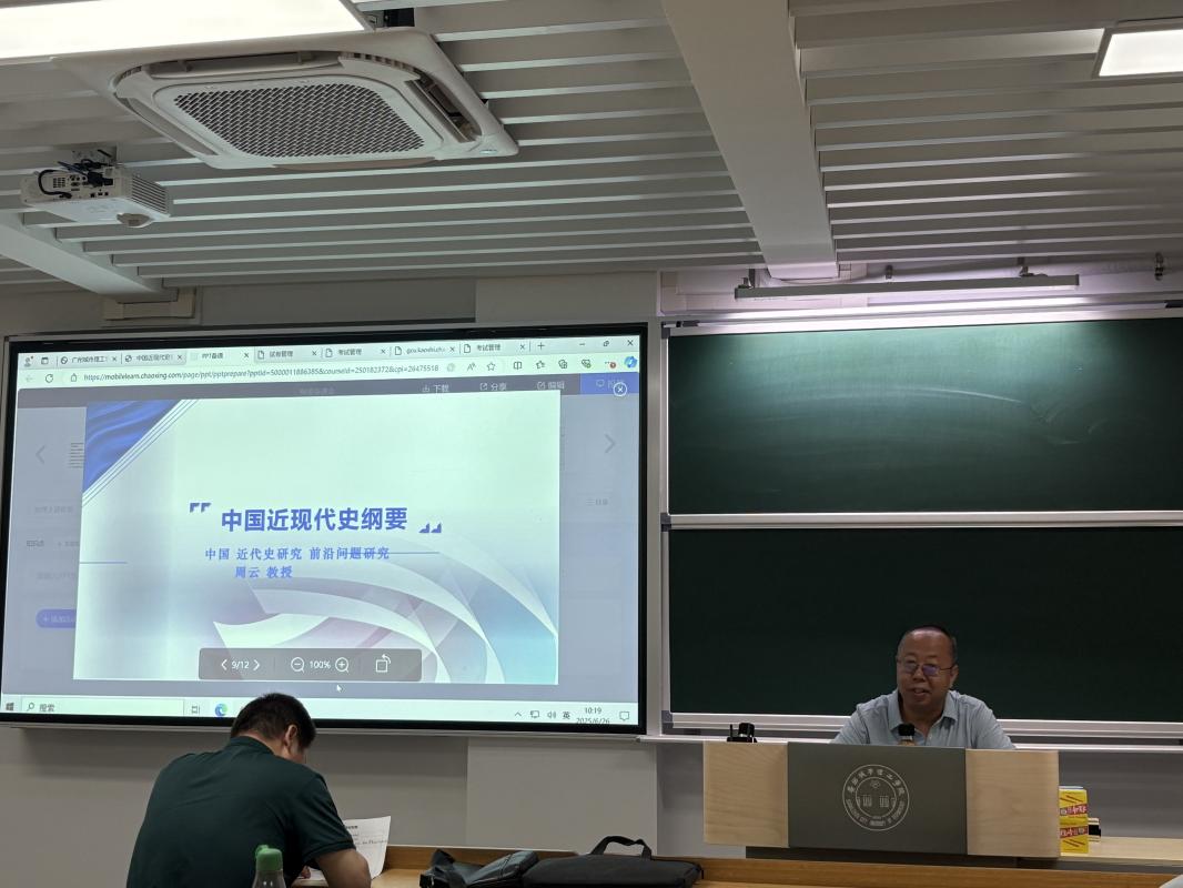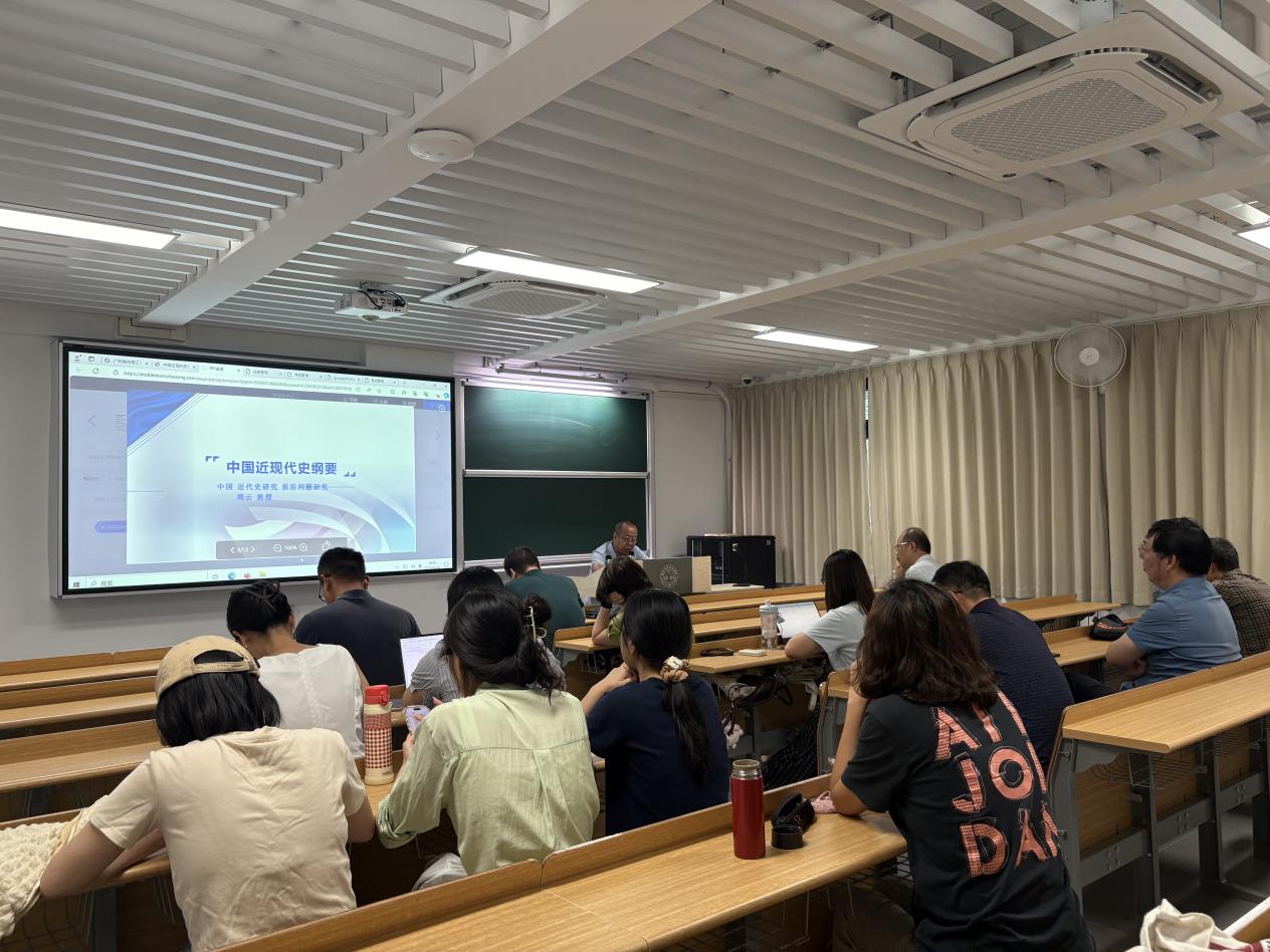 随后,作为教育部高校思政课教学指导委员会委员,周云教授结合新时代思政教育和课程改革要求,提出课程需紧扣中国式现代化进程。他强调:“教学应立足‘大历史观’,将理论讲授与地方实践相结合,尤其要融入广东改革开放的鲜活案例,帮助学生从历史逻辑中把握现实发展脉络。”周云教授在分享思政课教学改革经验时指出,教师可从三个维度深化研究:研究方向上聚焦中共党史与近现代史基本问题研究领域,倡导以微观案例切入宏观叙事的研究路径,鼓励从社会学视角解析党的基层群众工作实践,揭示历史规律与社会治理的内在关联;选题切入点上重视广东地方党史的研究价值;学术根基夯实重点研读《毛泽东年谱》《广东革命历史文件汇编》等一手史料,为青年教师提供兼具学术深度与可操作性的成长路径。