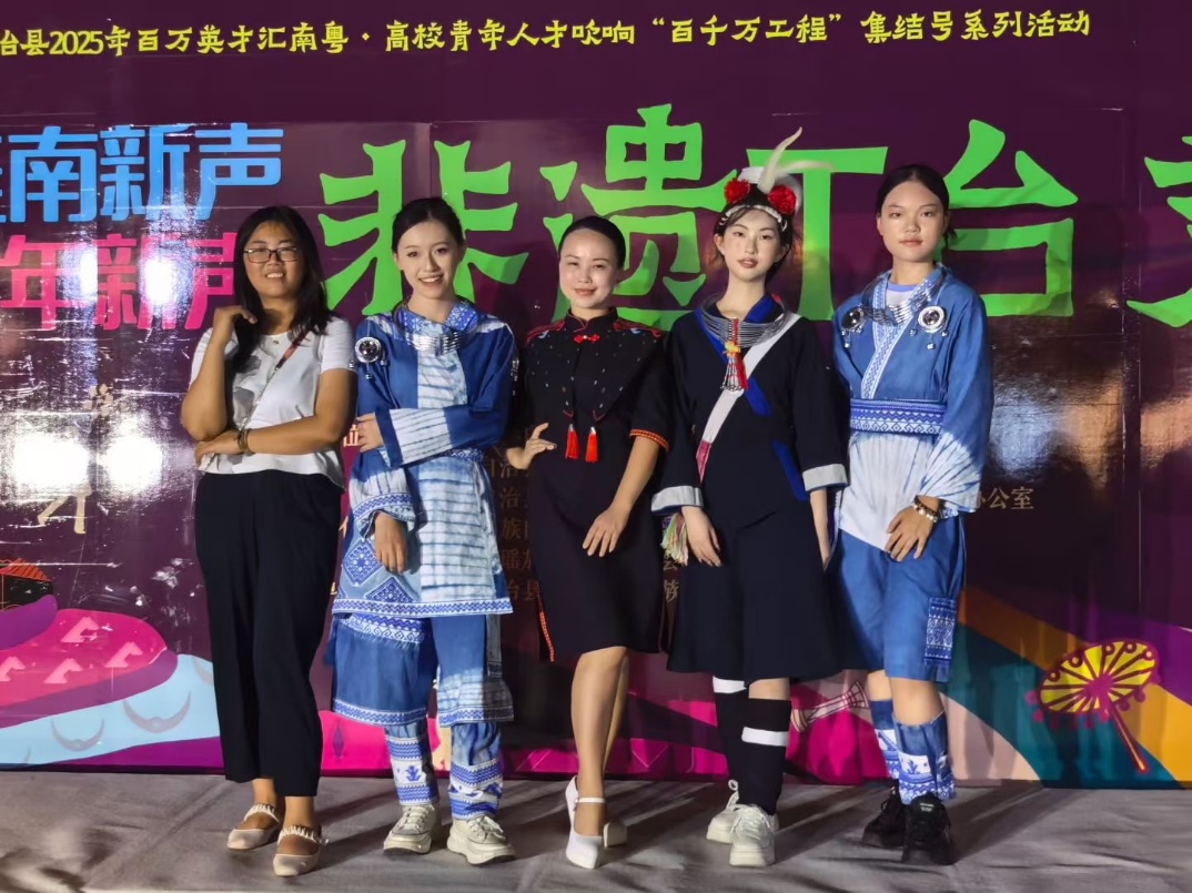 本网讯(记者 张素雅)7月17日晚,连南瑶族自治县在拾月拾陆瑶族(非遗)文创园成功举办“百万英才汇南粤·高校青年人才吹响‘百千万工程’集结号”活动。作为 “三下乡”社会实践队伍,七彩阳光实践团积极参与本次活动,团队成员方小女、阳星月、蒋欣伶积极助力“非遗新声”青年T台秀,为瑶族文化传承注入青春活力。