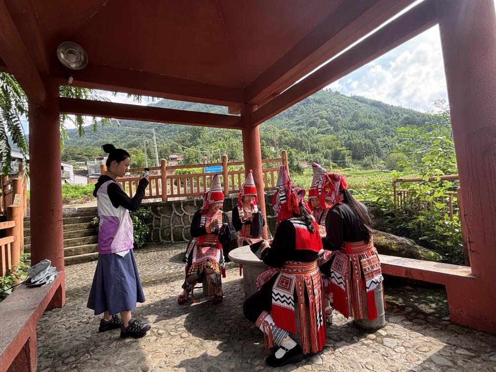 大麦山镇瑶族主要分为排瑶与过山瑶两大支系,文化习俗各具特色。下午,团队前往塘凼村探访过山瑶文化。与排瑶相比,过山瑶的服饰风格更为灵动精巧,村民们身着传统服饰配合宣传片录制,其标志性的尖尖帽子上绣满精致图案,银饰点缀其间,行走时发出清脆声响,展现出过山瑶独特的审美情趣与生活智慧。村民们热情配合拍摄,用实际行动助力非遗文化的传播。