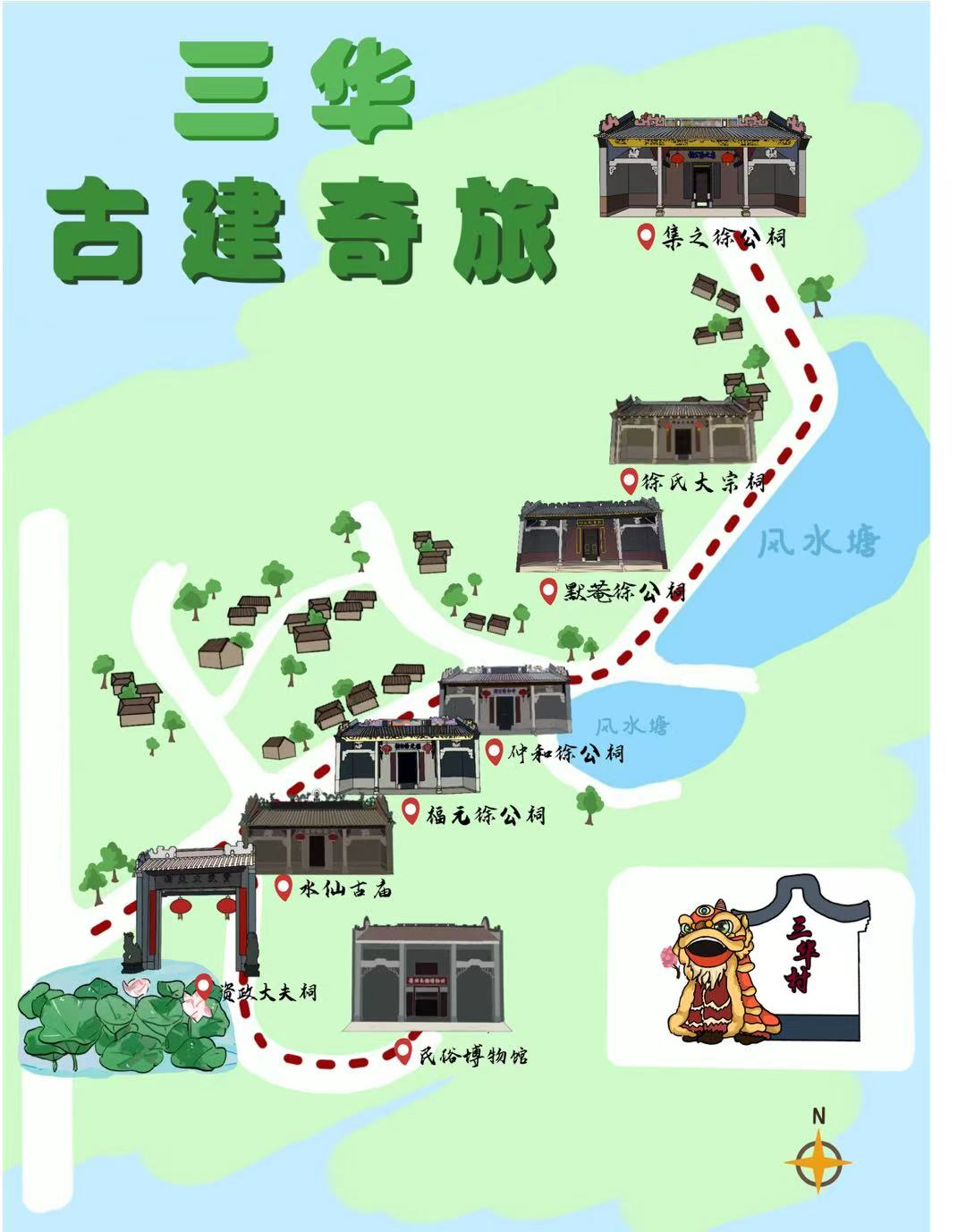 “三华村古建林立,祠堂众多,但是村中主干道的标志性建筑还是比较明显,我想以这个为出发点设计旅游打卡路线”,Young实践团文创组组长陈佳怡同学主动承担起了这项手绘地图的任务。从“民俗博物馆-资政大夫祠-水仙古庙-福元徐公祠-仲和徐公祠-默庵徐公祠-徐氏大宗祠-集之徐公祠”这一空间路线的确定,到主题风格、色彩搭配等元素的选取,再到场馆外景、标志特征、文字标注等元素的绘制,陈佳怡同学结合亲身体验、学习思考和实践感悟,坚持原创性和真实性,最终为三华村绘制出了具有鲜明地域性、标志性和故事性的手绘地图。