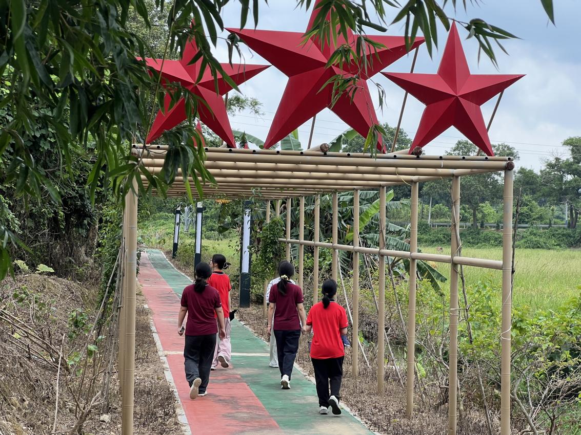 表竹村依托红色资源,逐步推动文旅融合项目深入发展,现已形成集爱国主义教育、红色旅游与乡村振兴于一体的综合发展模式。基于红色记忆的追寻,师生们开展了表竹村红色文旅项目调研,探寻表竹村借红色底蕴推进乡村建设、拓展教育实践场景。恰逢“七一”建党节,阳东区新洲镇表竹青少年军事拓展培训基地正式开营,行走间,大家沉浸式感受到红色文化与现代旅游发展理念交融的活力。据悉,表竹村红色文旅融合发展项目是在广东省民政厅“百社联百村”专项行动的指导下,阳东区为用好用活恩阳台独立大队活动旧址等红色教育资源而生,包括“军歌嘹亮-青少年军校、红旗漫卷-古村文创、红色记忆-耕读民宿、红星闪闪-荔红别苑”四个主题板块,而表竹青少年军事拓展培训基地正是红色文旅融合发展项目的重要组成部分,是将地方文化资源转化为推动地方经济发展新动力的生动实践。
