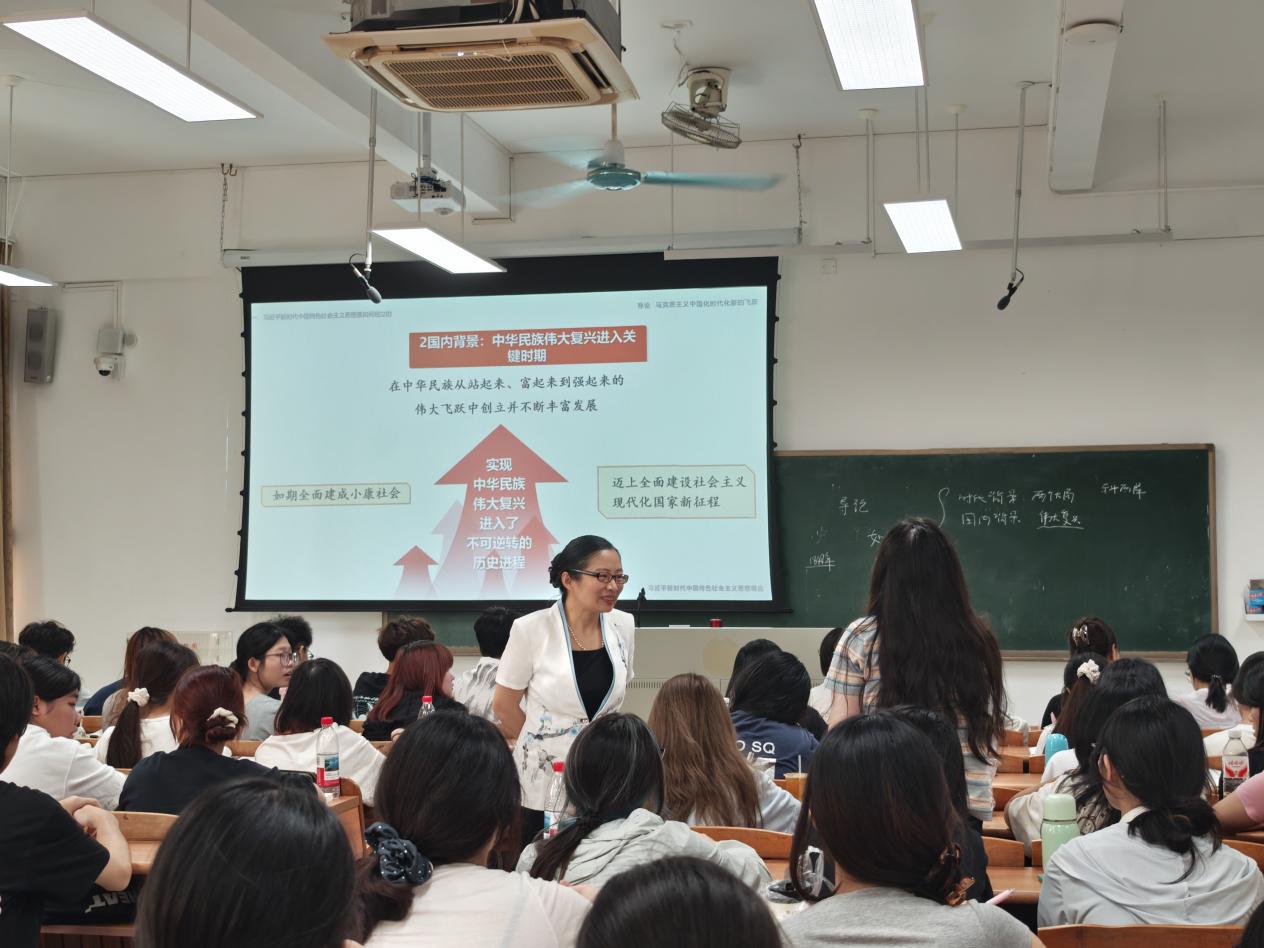 随后,邹春梅老师以问题式教学法设计课堂环节,围绕“习近平新时代中国特色社会主义思想是如何创立的”这一核心问题,从六个方面深入剖析。她详细阐述时代背景,分析复杂多变的国际形势;讲述国内背景时,结合我国经济、社会、文化等领域发展现状,让同学们感受伟大思想产生的必然性;提及实践土壤时,列举脱贫攻坚、科技创新等领域实际案例,使抽象概念变得生动可感;对于“两个结合”,邹老师结合暑期三下乡调研“广州市三华村古村文化的活化利用”进行深入浅出的解读,帮助同学们理解其内涵。同学们认真聆听,不时记录重点,沉浸在知识的海洋中。