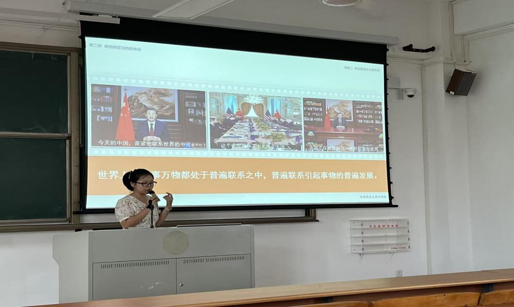 活动聚焦于课程中的马克思主义哲学部分的教学内容:第一章第二节“事物的普遍联系和变化发展”、第二章第一节“实践是认识的基础”、第二章第二节“真理与价值”以及第三章第二节“社会历史发展的动力”。分别由余茜、张秋爽、杨丽丽、李理、孙妍五位老师就相应内容进行了精彩的主讲展示。